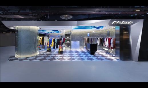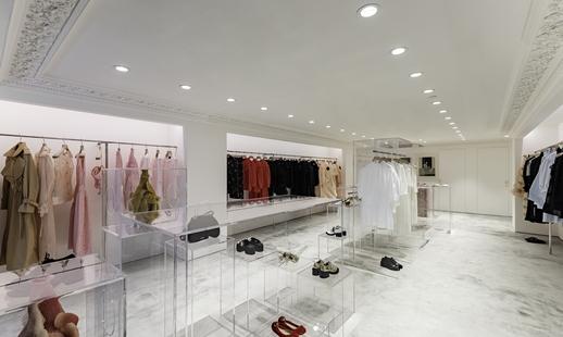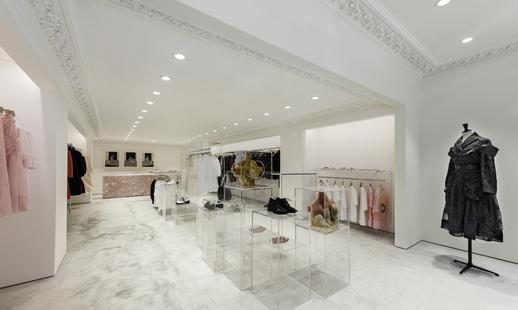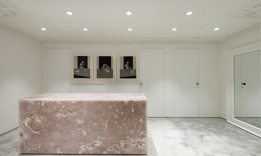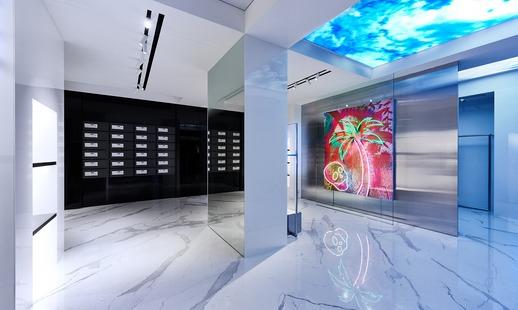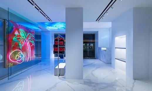 店內以混凝土磚牆塑造強烈對比,由波浪形玻璃隔板、地面鋪設經典的萬壽紅色及大花白色大理石。此外,天花板裝有LED屏幕,透過敞大的窗戶,於店外亦可輕易看見,與白色立方設計賦予成有趣的對比。